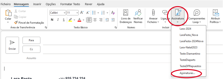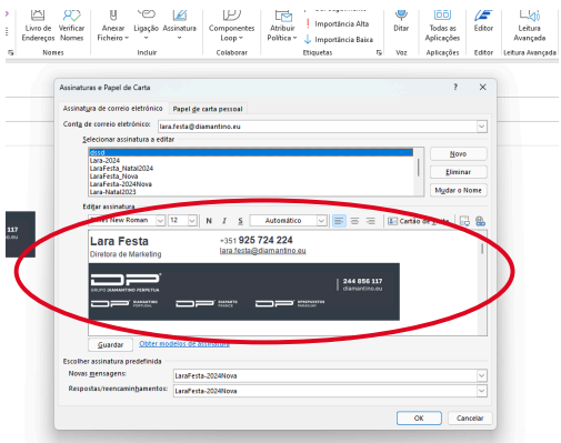 7. Ir ao ficheiro de word, fazer Copy da assinatura e fazer Paste no Outlook