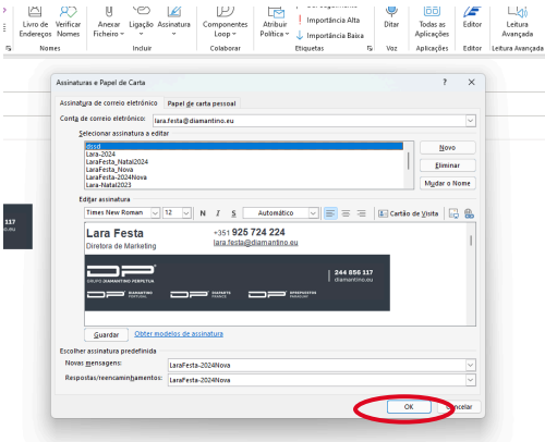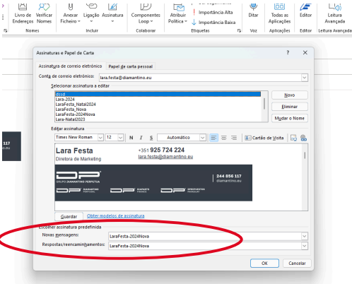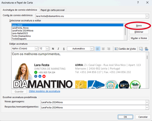 9. Selecionar a nova assinatura para “Novas mensagens” e para “Respostas/Encaminhamentos”